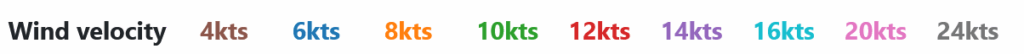 | Wind velocity | 4kts | 6kts | 8kts | 10kts | 12kts | 14kts | 16kts | 20kts | 24kts |